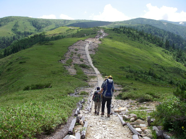 早朝の有峰口でバスを乗換えて折立へ向う。登山口からしばらく樹林の急登に汗を流し、森林限界からは比較的平 坦な登山道を景色を眺めながらゆっくり 歩く。荷物が多いので多くの登山者に追 い抜かれる。