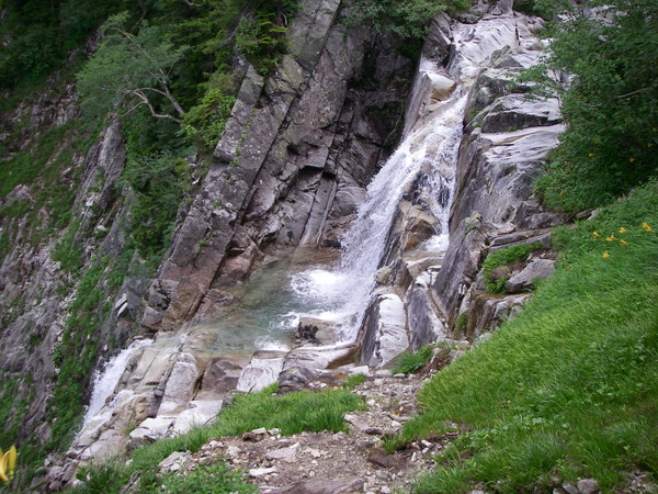 朝食のオートミールをすすって出発する。薬師沢小屋まではひたすらの下り。お花畑の中のベンチで一度休んで 2時間ほど掛けて小屋まで下る。ここか ら沢靴に履き替え河原歩きを始める。