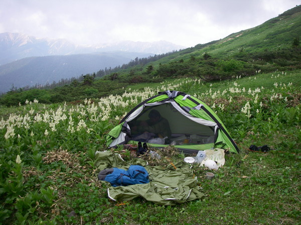 重い荷にへとへとになりながらも、美しい渓の写真を撮りながら幾つかの滝を越え、大滝を高巻き、源流に這い上がる。黒部五郎までの気力なく稜線手前のコバイケソウの群落の中にテント を張り今夜の ねぐらにする。