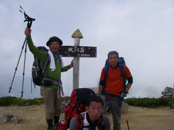 双六岳を経由し鏡平小屋に泊る。夕食の前後とも残ったお酒を呑んで最後の夜を語って過ごす。