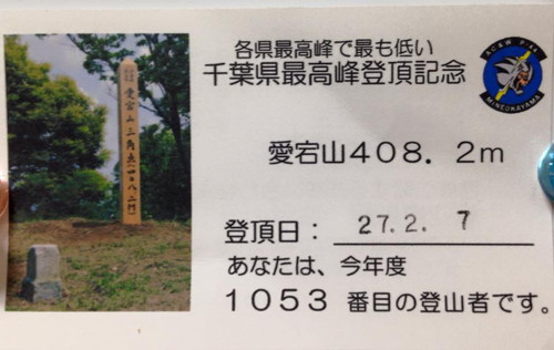 千葉県最高峰「愛宕山」までの移動中に、酪農発祥の地・嶺岡牧場へ立寄り。食後のデザートにソフトクリームを食べた。12時を目 指して峯岡山分屯基地(航空自衛隊)へ。強面の犬・ジャーマンシェパードの手厚いもてなしを受けて入場。駐車場からは鴨川市街が 一望できた。広報係の自衛官の案内の下、私たちのほかに3グループほどが一緒に移動した。神社を越えると間もなく愛宕山山頂 (408m)へ到着。先ほど登った伊予ヶ岳方面の眺望が素晴らしい。自衛官と敬礼ポーズで一緒に記念撮影をして帰路へつく。