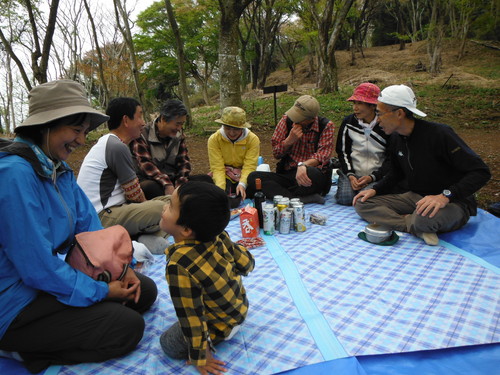 2回ほど途中休憩し、10時20分頂上に着いた。子供たちも元気いっぱいであった。頂上で記念撮影をし、15分ほど下ると、 「こぶしの森」という広々とした平地(トイレあり)に出た。ここでシートを敷き昼食兼宴会をした。例によって豚汁を作り、缶ビー ルやオニギリを食べる。ワイワイと飲み食い,おしゃべりをしたら1時間がアッという間に過ぎ、12時20分過ぎ後片付けをして極 楽寺ルートから下山の途についた。