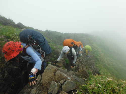 登山指導センターにて登山届を提出し、体力 増強のために各自の自信に応じて水を担ぐ。9時に西黒尾根を登り始める。のっけから樹林の急登。途中で雨が強くなり雨具 上衣を着用する。鎖場が出てくると濡れた滑りやすい岩、遠い足場、重いリュックに苦労しながら手足をフルに使って登る。 途中には高山植物がたくさんあり、いしちゃん、ほりちゃんが名前を教えてくれるが覚える余裕はない。ガスと小雨は続くが 風がなかったので寒さは感じなかった。途中休憩中に馬蹄形縦走をする12名のツアーに追い越された。今日は蓬峠まで行く という。時間的に大丈夫かねーと自分のことを棚に上げて心配する。(翌日蓬峠ヒュッテで聞くとツアー客は19時過ぎに到 着したとのこと。)