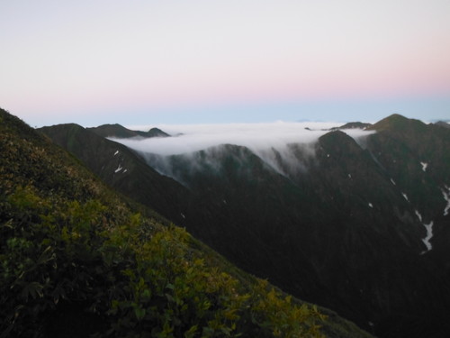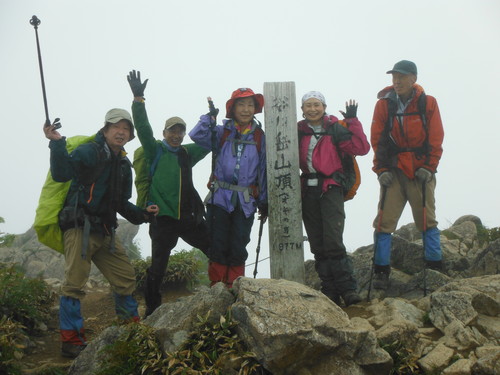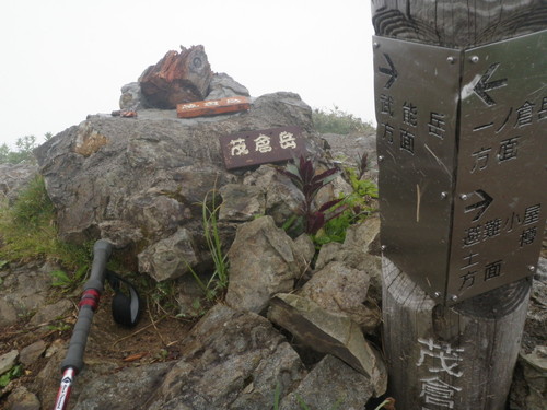 5時に茂倉岳到着。富士山から上越の山々が 全て見え、全員写真を撮りまくる。茂倉岳から一旦下り、武能岳に登り返す。ここから見る茂倉岳は立派である。たくさんの 花を見ながら雲に包まれた蓬峠ヒュッテに下る。