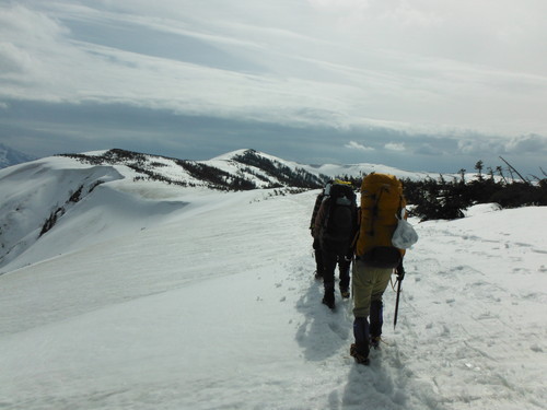 今回はサワさんが学生時代以来のテント 泊、初雪山登山であったが、驚異的な体力で全行程を遅れるこなく歩いた。恐るべし。 (マコミズ記)