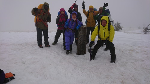 4月30日。夜半から風雨が強まりテントが撓む。3時起床。朝飯は お馴染みの餅入りラーメン。強風の中テントを撤収して5時40分に出発。横風が強くまっすぐ歩けない中も6時 17分に会津駒ヶ岳に到着。山頂標識が半分以上埋まっているので積雪は2メートル位か。ガスと風の中で慎重に方 角を見定めて駒の小屋に下る。30分くらいで小屋に到着。ここまで下ると風は弱まる。少し休憩して下山にかか る。雪の急斜面の下りは慎重に下る。さすがにこの登山道は登る人が多い。雪がなくなると泥道を下り登山口の階段 に出た。車2台を回収して近くの窓明の湯で汗を流し、道の駅で蕎麦を食べて帰宅した。
