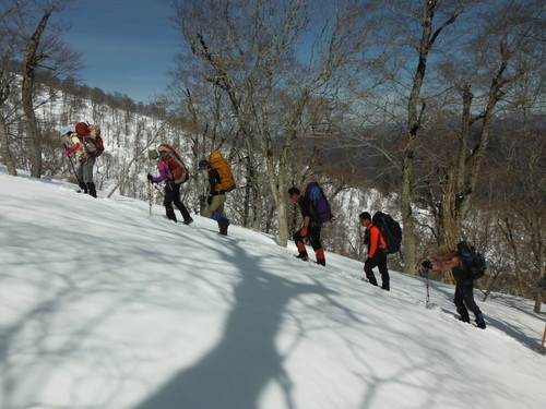 今回の参加者は8名と盛況であった。4名は27日中に小豆温泉駐車場に 入ったが道中は雪になり明日以降の山行が一層楽しみとなった。