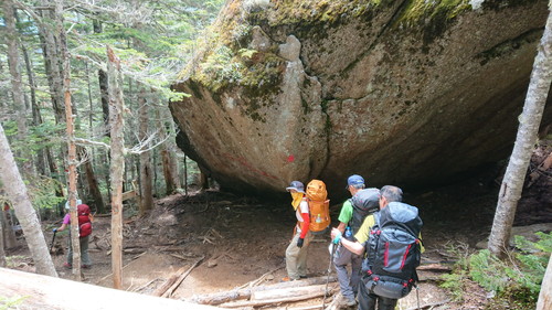 6月17日 夜中にトイレに起きたら月明かりと星空が美しい。4時10分起床。餅入りラーメンと残りのちらし寿司で朝食 を済ませてテントを撤収。濡れたフライは重い。6時に鳳凰小屋を出発し砂場の急斜面を登って賽の河原に到着。お地蔵様の 向こうに甲斐駒が見える。地蔵岳のオベリスク基部まで登った後に赤抜け沢の頭へ。ここからは白峰三山、仙丈、甲斐駒が一 望できる。花崗岩の稜線を南下して観音岳(2841m)に到着。ところどころにキバナシャクナゲが咲いていた。さらに南 下して薬師岳に至る。ここで白峰三山とはお別れとなる。10時40分に中道を下山開始。ここも樹林帯の急下降で足場が悪 い。1時間ほどで御座石の巨岩に着く。誰が運んできたのでしょう。さらに樹林帯の急下降で1時間歩いても景色が変わらず うんざりしてくる。忍耐力が必要であり、体力増強か耐力増強かわからない。足に疲労がきて転倒者続出。14時50分に やっと林道に出て青木鉱泉には15時40分に着いた。青木鉱泉の風呂に入り途中のSAで夕食を食べて21時過ぎにニュー タウンに帰り着いた。