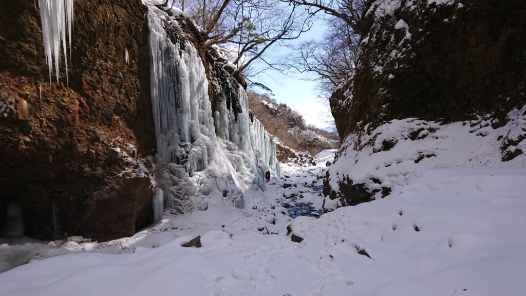 雲竜渓谷に氷瀑を見に行った。今年は雪が少ない。林道終点に車を止め河原を行く。砂防堰堤から右側の道を登るつもりだったが道が見つからず、あきらめて左側の林道を登った。雲龍渓谷入口でアイゼンを付ける。雲龍瀑は昨年の方が大きかった。林道を戻って駐車場に帰った。時間があったので日光隠れ3滝のうちの丁子の滝、玉簾の滝も見に行った。 (マコミズ記)
