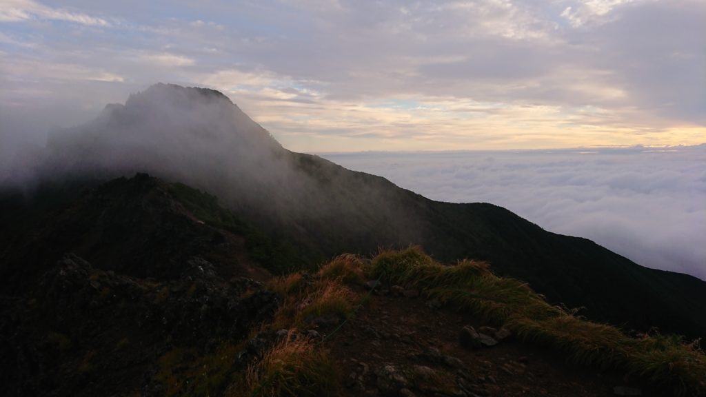 9月4日 5時20分雨の中を美濃戸まで林道を歩き、その後北沢を登り赤岳鉱泉に8時15分に着いた。自炊場の屋根の下で一休みしてから行者小屋に9時20分到着 地蔵尾根を登る。上部はハシゴが連続する。10時30分に地蔵の頭に着いたがガスのため先に赤岳展望荘に入る。宿泊手続きをしてコーヒーを飲み、ストーブで体を温めてから空身で横岳に向かう。切れた断崖もガスで下が見えないので怖くもない。横岳奥の院に12:20に着いた。展望荘に戻り食堂でビール、日本酒、焼酎をちびちびやりながらおしゃべり。17時から夕食 その後は談話室でまたおしゃべり。20時には床についた。