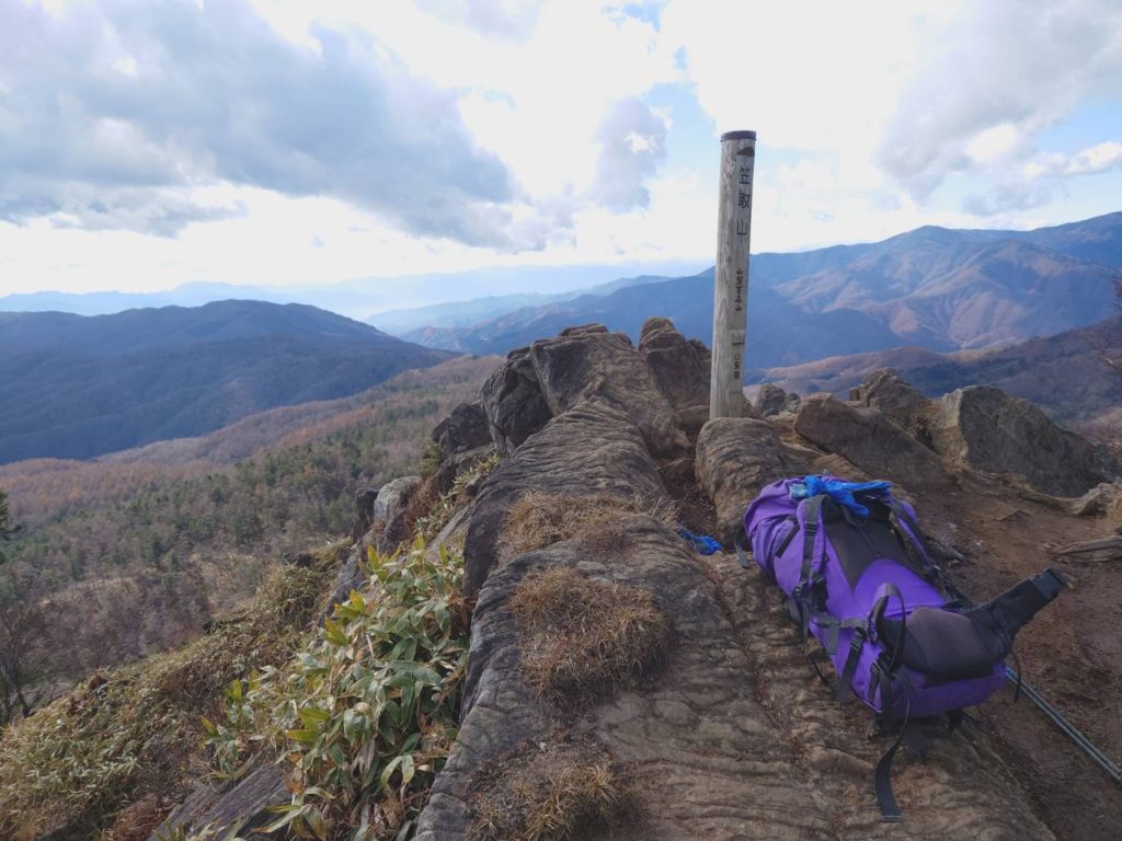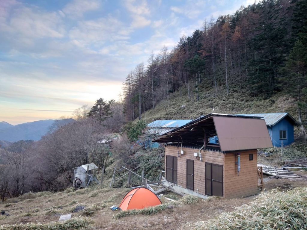11/12:朝霧山荘、JR平井駅(04:52)⇒塩山駅(07:25)タクシー⇒新地平登山口(07:57-08:02)⇒雁峠(10:35)⇒笠取山1,953m(11:30-11:37)⇒唐松尾山2,109m⇒将監小屋(15:55) 消灯(18:00) 朝、ヒョウ後晴れ