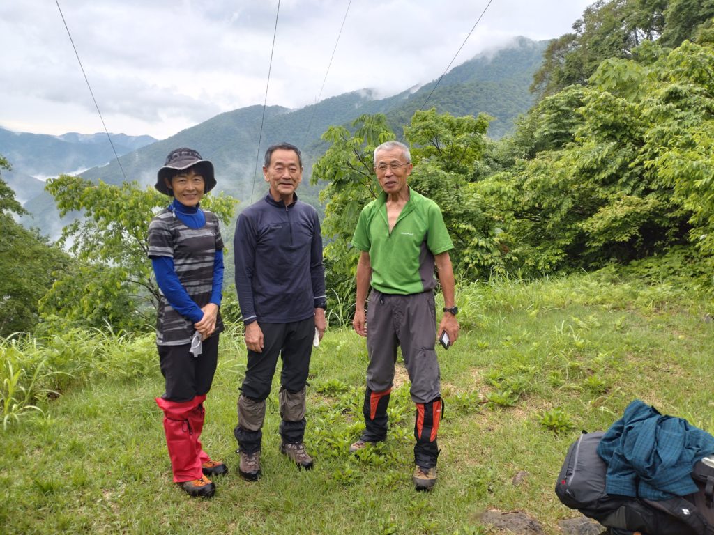 6月12日(日)3時起床 朝食を済ませてテントを撤収 雨に濡れて重い。4時35分出発しビジターセンターで水を補給して5時に西黒尾根登山口からスタート 約30分で送電線鉄塔に着いた。山頂部は雲で見えないが期待を込めて登っていく。ところが雲が濃くなり巌剛新道合流点あたりで雨が強くなったので雨具ズボンをつける。岩は滑りやすく荷物は重くペースが上がらない。上部で雪田をトラバースして雨と風の中で肩の小屋に10時に着いた。西黒尾根の登りで5時間かかった。小屋従業員からこれから更に風が強くなる予報で蓬峠まで行くことはお勧めできないとの忠告を受け、空身で山頂をピストンした。蓬峠から来たという2パーティと会う。蓬峠から5時間かかっている。 茂倉岳の登り(こちらから行くと下り)では大分残雪があったとのこと。小屋に戻り天神尾根を下る。下りはじめの雪田の下降は軽アイゼンをつけて下った。アイゼン無しではちょっと危ない。雨の中で滑りやすい石尾根を下り熊穴沢避難小屋に着く。ここで今晩食べる予定であったトマト鍋を作って昼食とした。体が温まりホッとする。ロープウエー駅で一瞬青空も見えたがすぐにガス。駐車場に戻り湯テルメで汗を流した後帰宅の途についた。下界では青空が広がっていた、
