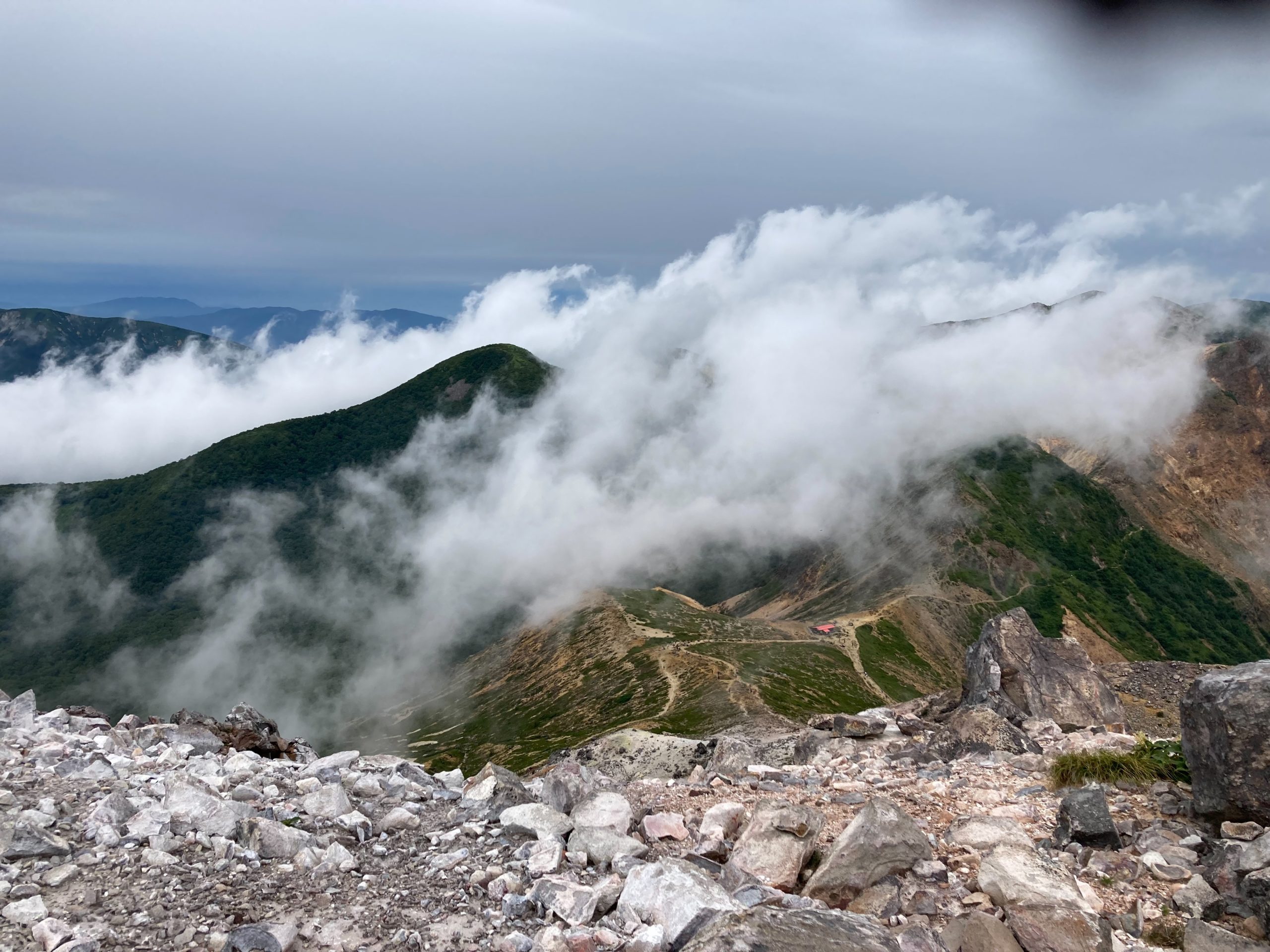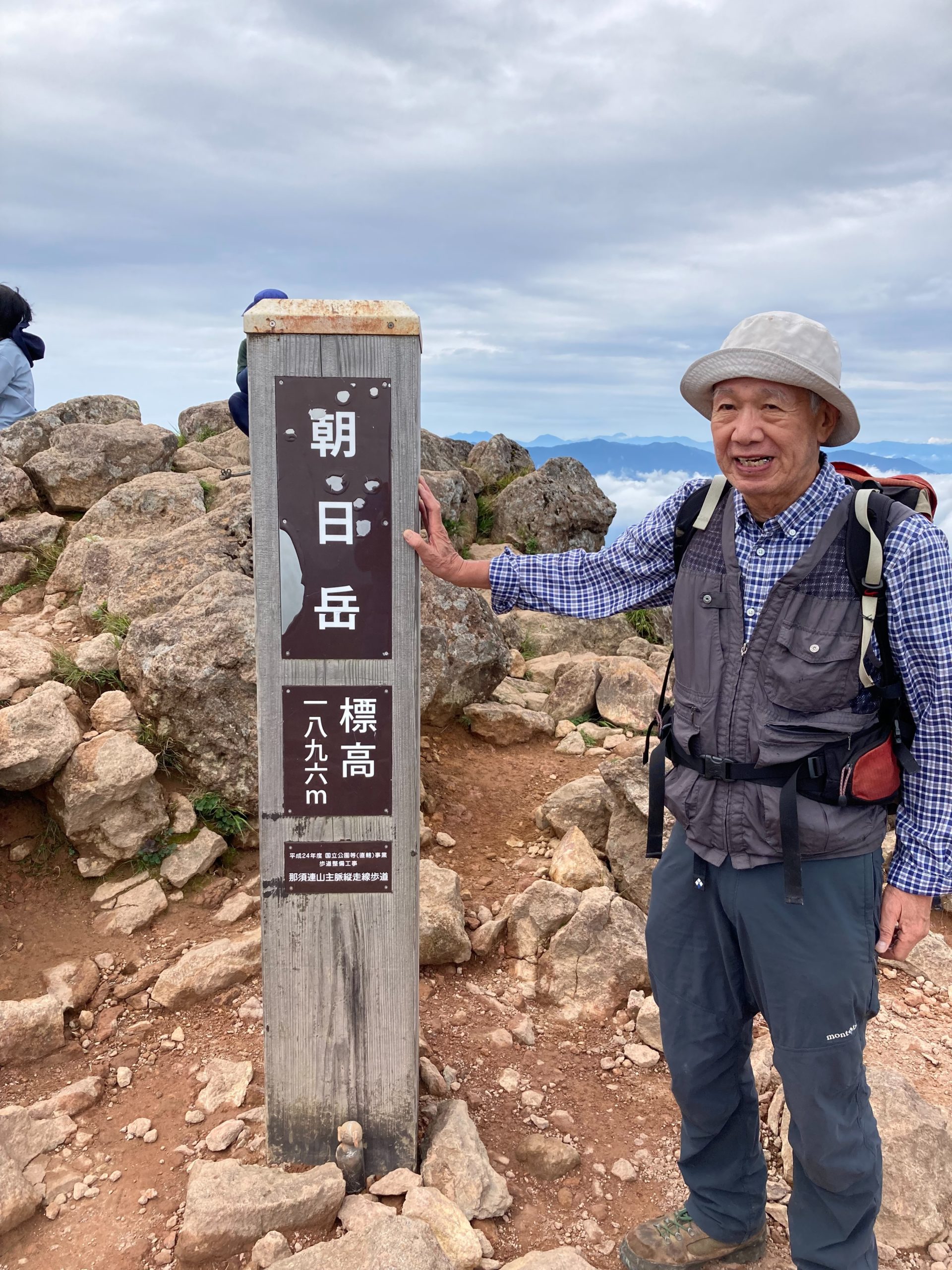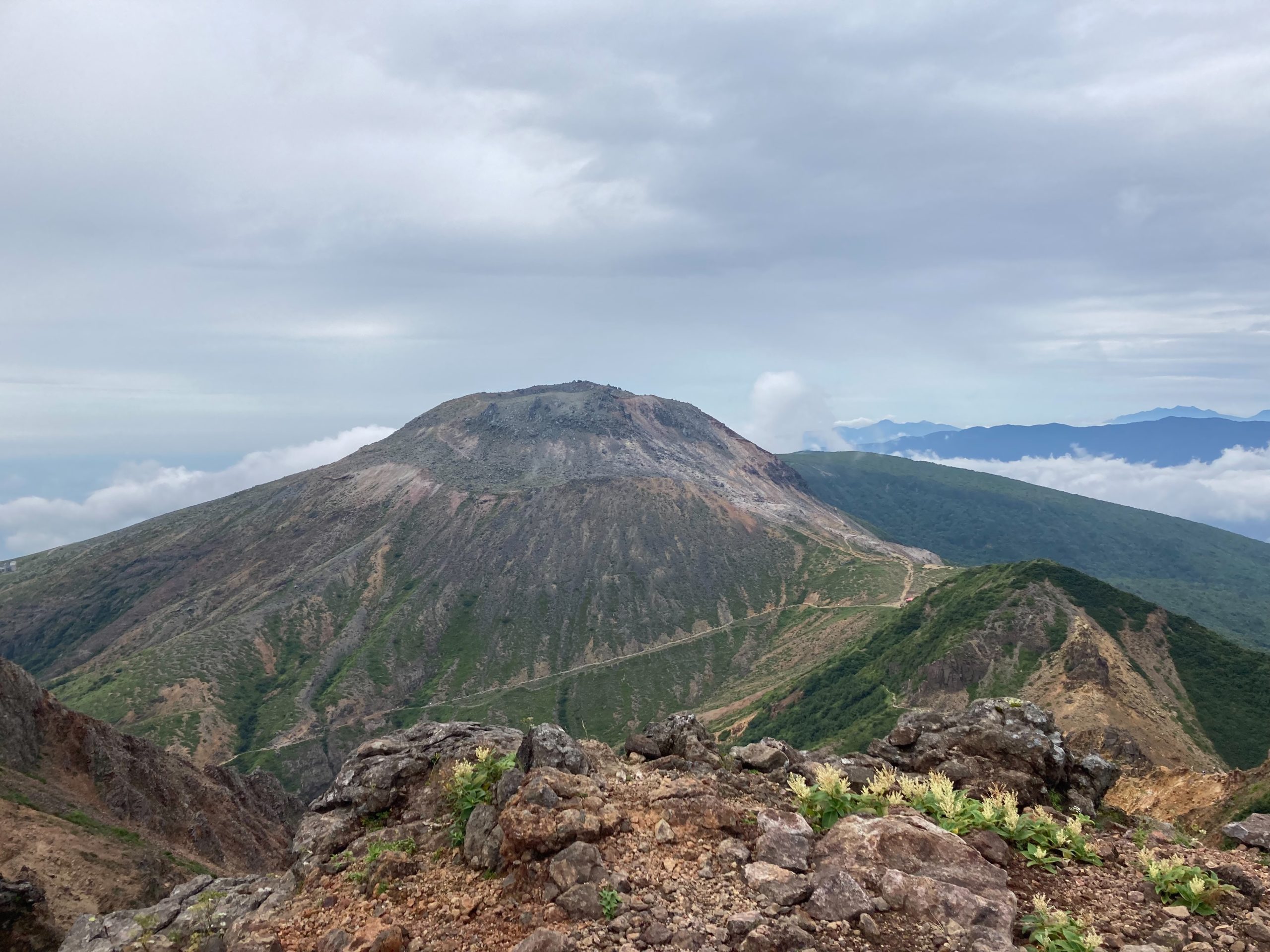 朝3時半自宅出発。夜明け前の道路は車もほとんど走っていない。常磐高速道路に入り、やっと夜が明けてきた。那須の県営駐車場到に7時20分着。すでに駐車場は満車状態で、やっと隅っこに一台分の空きがあり、そこに駐車した。7時40分出発。昨年と同じ8月の土曜日だが、登山客は少ない。峠の茶屋跡には8時25着。女性登山客が多く、やたらにぎやかである。幸い天気は高曇りで涼しく快適である。剣が峰を巻いて、岩場を登っていけば朝日岳の肩だ。昨年は三本槍への道を急ぐあまり、朝日岳の頂上へ登らず通過してしまった。今回はゆっくり10分ほどで頂上へ。どっしりとした茶臼岳が目の前に迫る。