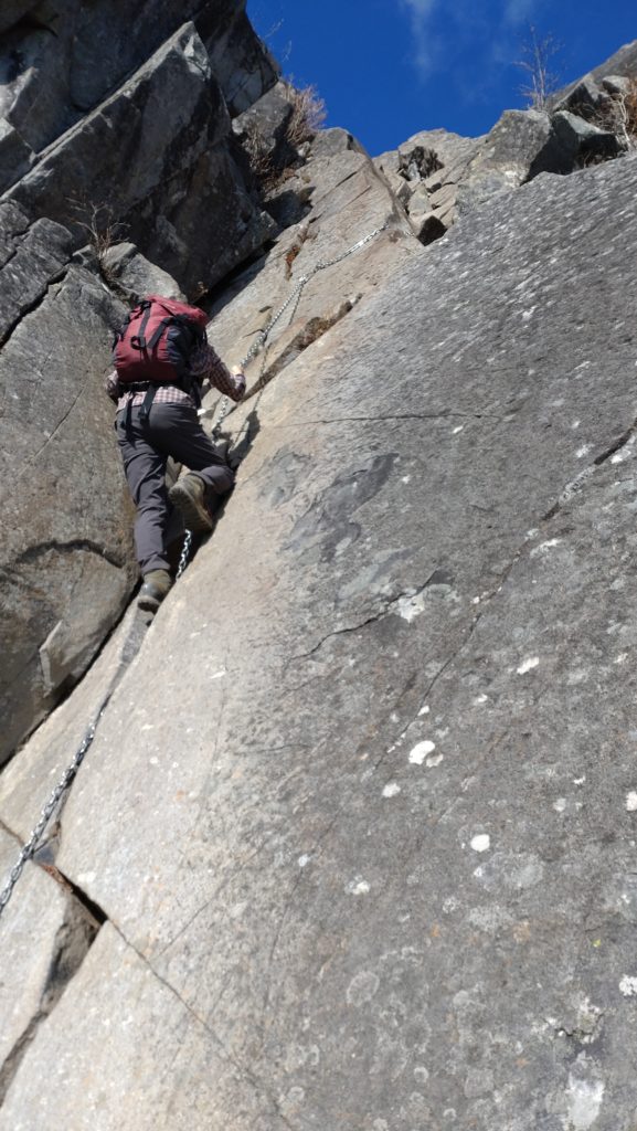 5時車発 千葉北IC、勝沼IC経由で徳和駐車場に8時過ぎに到着。駐車場には5台くらい停まっていた。土日であったら凄かったろう。林道を歩き乾徳山登山口から山に入る。同行2名の足が速く一人遅れ気味。錦晶水は水量豊富。国師平からは乾徳山がきれいに見える。尾根に上がり岩場帯に入るが、すでに足にきていて岩の登りに苦労する。雷岩、鳳岩を鎖を頼りに登って山頂に立った。景色は最高で風もなく1時間くらい滞在した。北に下りるが尾根からの下りが足場悪くよれよれになる。よく清掃された高原ヒュッテで大休止後に道満尾根を下って徳和に戻った。