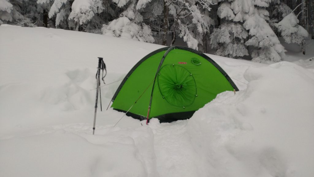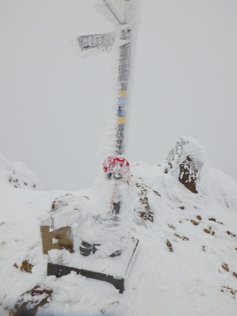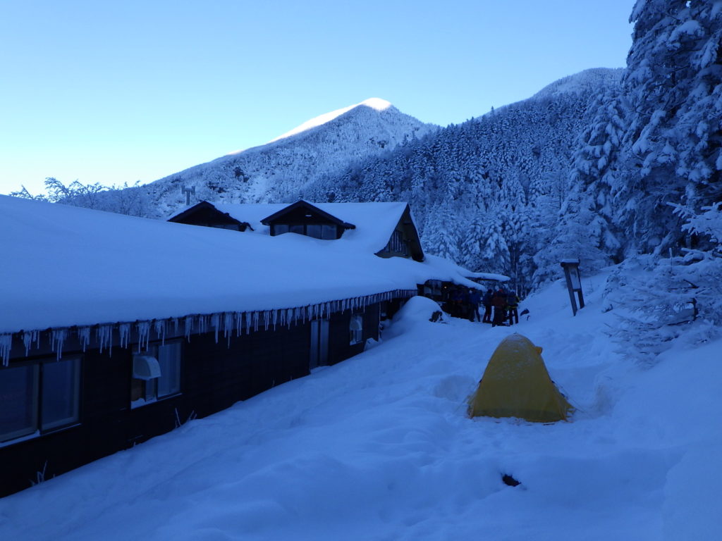 26日 4時起きで餅入りラーメンを食べる。明るくなるのを待って行者小屋に向かう。中山乗越はトレースがしっかりあった。行者小屋にはテント3張り 文三郎尾根にもトレースがあった。中岳分岐からは風も出てきたが大したことはない。凍った鎖を掴みながら赤岳山頂に着いた。ガスで何も見えず。山頂小屋の陰で大休止とする。展望荘までの下りは雪の斜面で夏よりも楽に下れた。相変わらずガスがあるので横岳はあきらめて地蔵尾根を下る。雪の急斜面、ハシゴを気を付けて下り行者小屋に着いた。天場に戻り小屋でビールを買って祝杯を挙げた。夜は担ぎ上げた野菜キノコ鍋で温まりシメはうどん。ワインとお酒を空にして20時前に寝た。昨日ほどは冷えなかった。夜は星空であった。