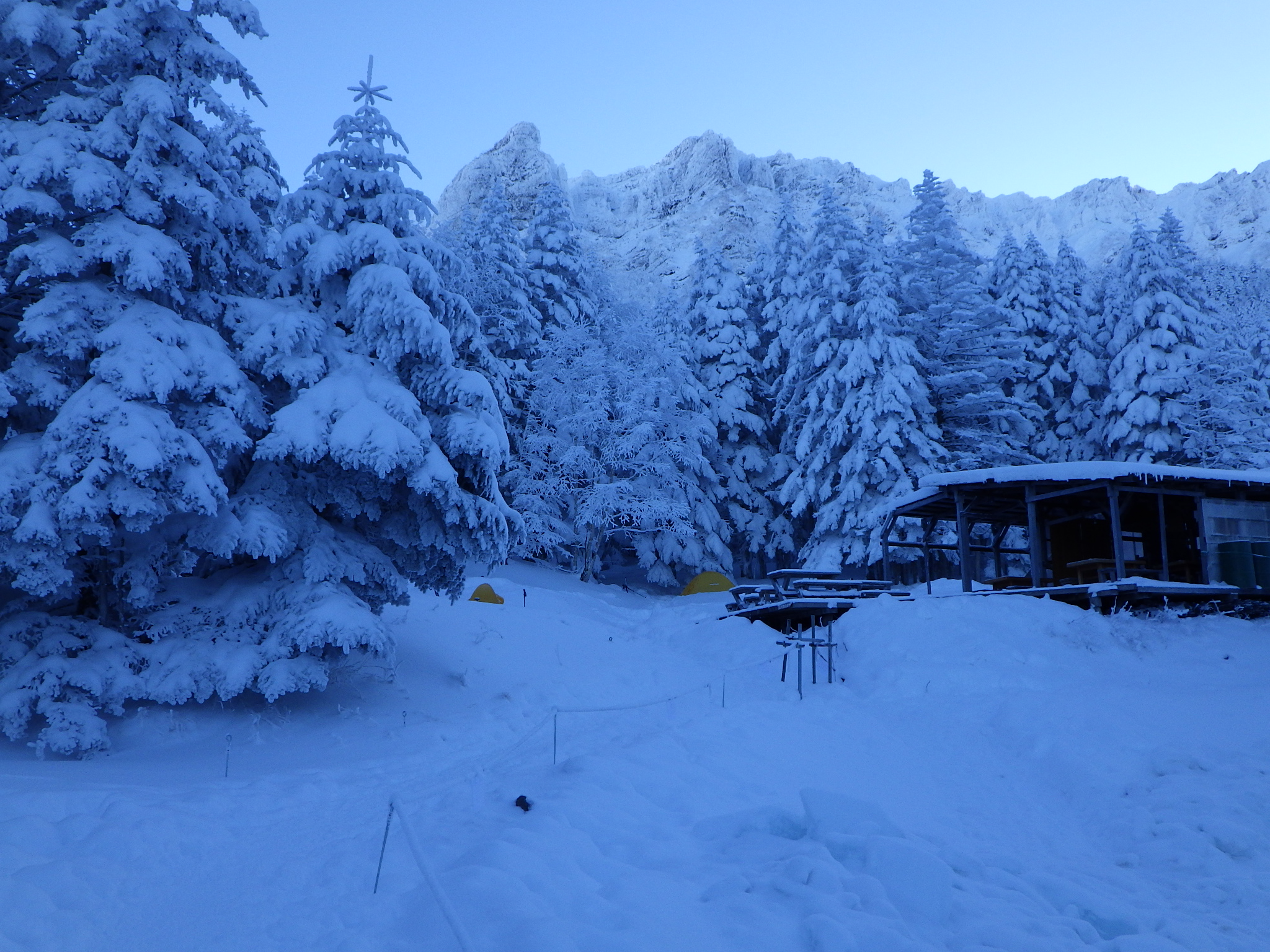 27日 4時起床 昨日の残ったうどん(凍結していた)を温め直して朝食とする。外は青空である。テントをたたんで下山する。雪と霜が付いたテントは重たい。美濃戸口に下山してタクシーを呼ぼうとしたら登山客を乗せたタクシーが上がってきたので、それを捕まえて樅の湯に行き入浴 タクシーで茅野駅に行き、駅前の蕎麦屋で打ち上げをして14:16のあずさで帰った。車窓からは八つが綺麗に見えた。