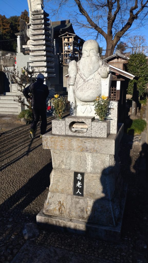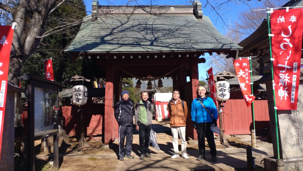7時に白井市福祉センターに集合 カクさんとトシさんは自転車で来た。新年の挨拶を交わした後にスタートする。7:15薬王寺 弁財天 この後カクさんは所用で帰宅し、残り5人で8:00秋本寺 毘沙門天 8:30佛法寺 寿老人 9:00長楽寺 恵比寿 9:50来迎寺 布袋尊 10:20再輪寺 福禄寿 途中のコンビニで昼食をとった後 12:00延命寺 大黒天に参って七福神巡りを終えた。最後の延命寺は思ったよりも大きなお寺で、周囲の民家も大きな屋敷が多く歴史を感じさせてくれる。時間があったので最後に阿夫利神社にもお参りをした。豚汁を頂き焚火で温まった後にウエルシアの前で解散とした。歩行距離25km 6時間強のハイキングでした。