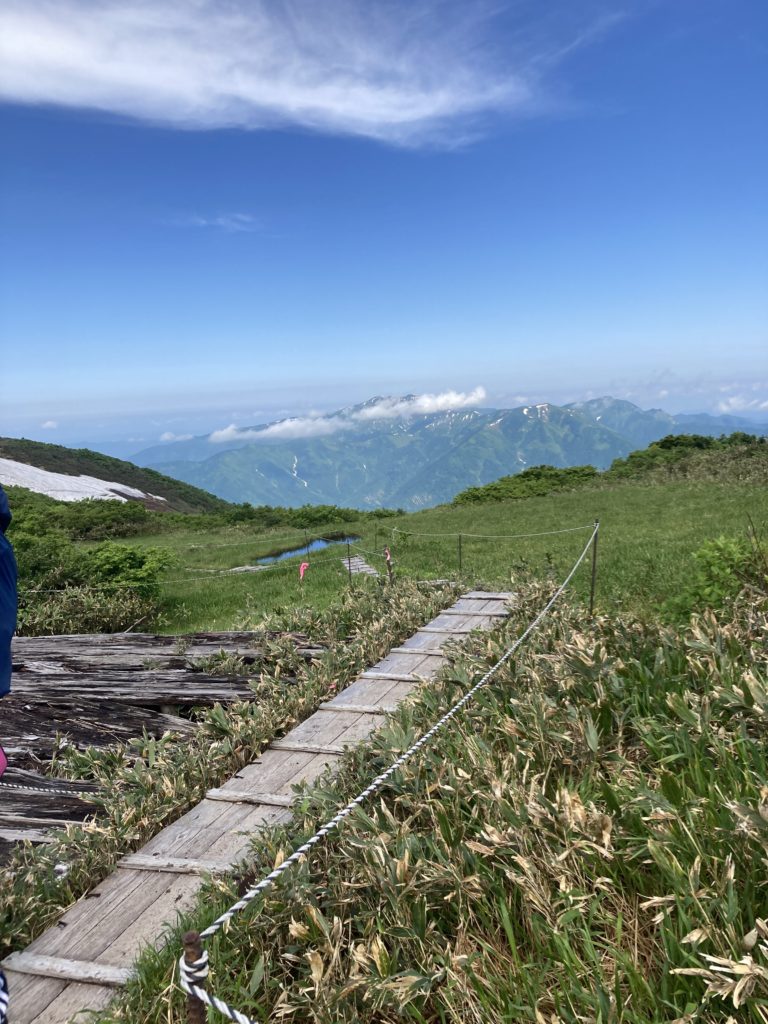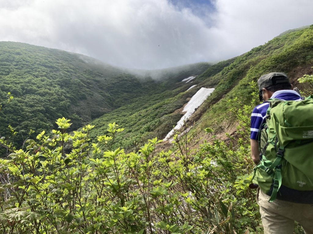 4時起床。宿が用意した朝食のおにぎりを食べ、5時に民宿「休み場」を出発。登山口であるネズミモチ駐車場までは狭い林道を30分ほど走った。駐車場は、かなり広く、車100台以上は駐車できそうだ。山靴に履き替え、身支度し5:50出発。林道を10分ほど歩くと左に標柱あり。ここがネズモチコースの登山口である。しばらくはゆるやかな登りだが、昨日の雨の影響でぬかるんでおり滑りやすいので慎重に登る。やがて本格的な登りとなる。樹林帯の登りが続き、登山口から約2時間半ようやくゆるやかな登りとなり視界が開けた。前岳の分岐に到着した。浅草岳の山頂に続く道が見える。途中雪渓の登りあり。キックステップで慎重に登る。雪渓を登り切り、草原の中の一本道を登ること15分ほどで浅草岳の山頂に達した。9時20分であった。快晴なので山頂からの眺めは素晴らしい。越後三山はもちろん、遠く飯豊の山々も見えた。記念写真を撮り、風が冷たいの長居をせず下山にかかり三叉路手前で大休止。早目の昼食とした。浅草岳は人気の山のようで、登山客が続々と登ってくる。