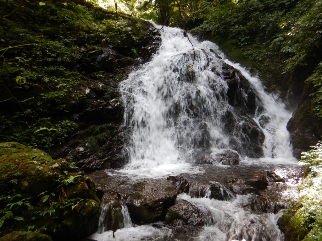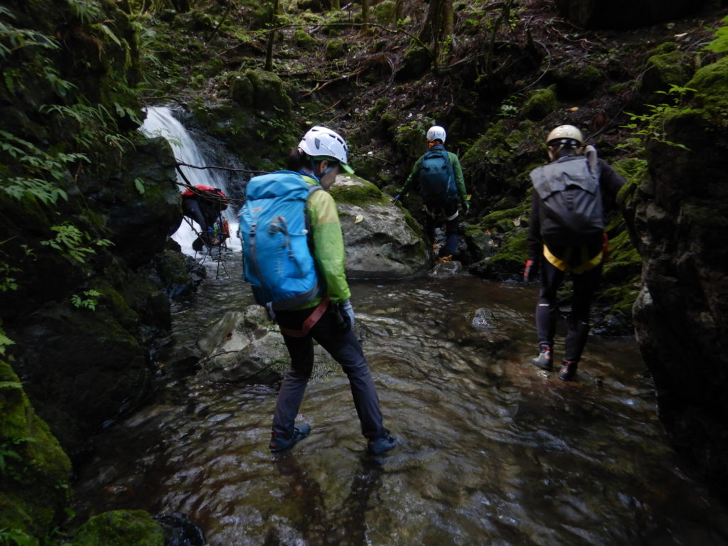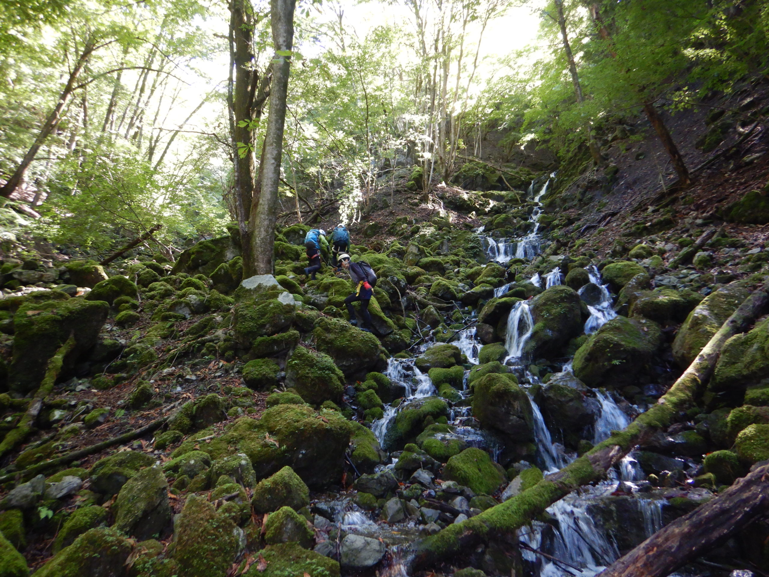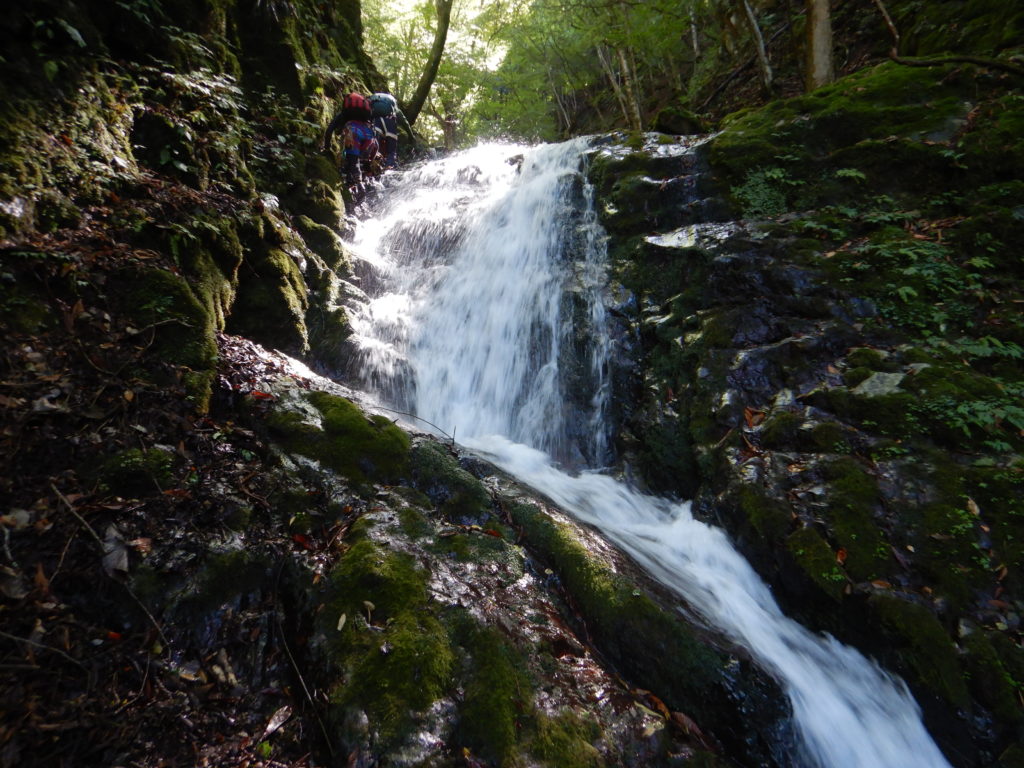 流水を分け入り、みずみずしい苔を踏みしめ、時には荒々しい岩に取りつく感触は今までにない体験でした。後半の詰めは四つ這いになって獣の気分。沢登りはまさしくプリミティブ(原始的)な登山であり、自然の懐に分け入らせてもらった瞬間でした。 バンビ記
