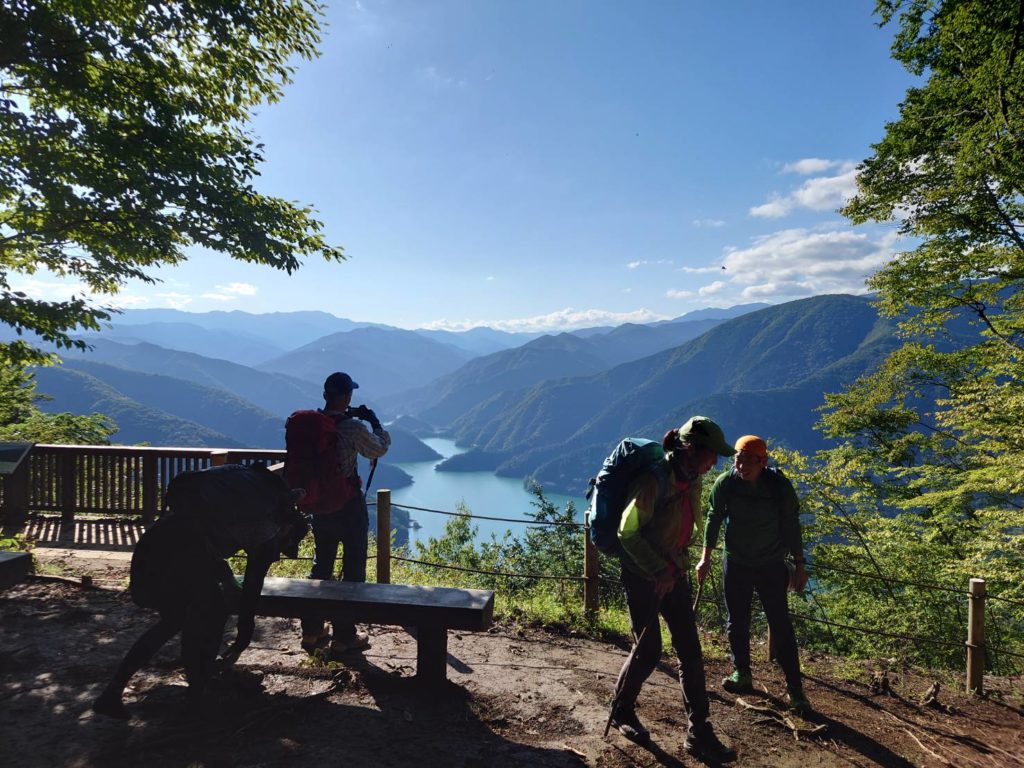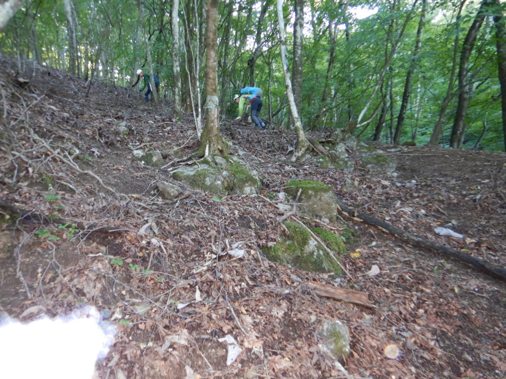 先月の定例会で先輩方の沢登りの報告を見聞きして、ワイルドだけど楽しそうだと思い今回の初心者向け企画にハイハイと手を挙げた。が、しかし沢靴等の装備の心配をするあたりから今までの山歩きとは違うことに改めて気づき、入門書や行かれた方のブログを読んでますます不安になってしまった。そう、沢登りは多分に岩登り的要素が強いうえに、沢は水流と不安定な足場でできているからだ。事前講習にも参加できてない私は前日の雨も相まって「大丈夫か私…」という思いのまま参加したのであった。しかしその大きな不安は杞憂であった。沢靴に履き替え恐る恐る入渓。思ったほど冷たくない。さらにフェルト底の力か滑らない。フラットな着地を心掛けながら先輩の登りを参考に沢を遡上する。途中何か所かの難所は先輩方に確保してもらい通過。無事渓谷から離脱。さて後は斜面を登るだけだと山靴に履き替え登り始めたらこれがとんでもない急登。おまけに登山道ではないから当然足場はグスグス。沢から尾根道に出るまでを「詰め」と言うそうだがまさに詰めが甘かった。キックステップや木の枝の杖を使ってなんとか尾根道に出たときは本当に登山道のありがたさを感じた。