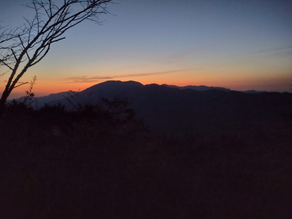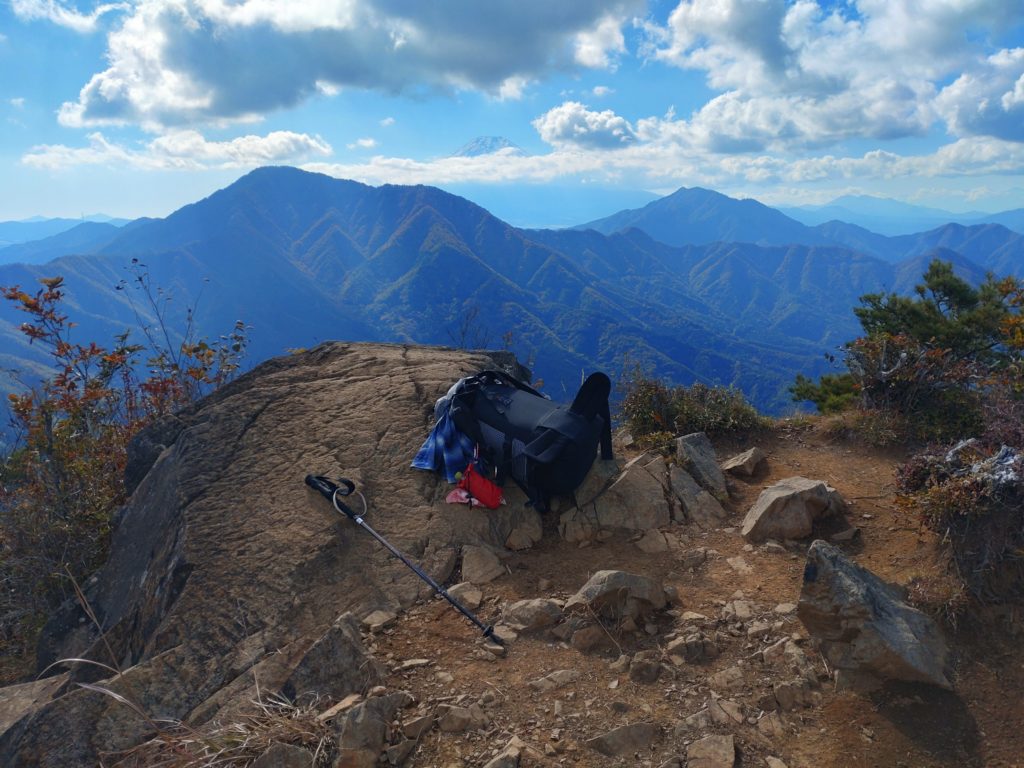 1日5:06の電車に乗り8:07に赤坂駅に着いた。バス道路を一時間強歩くと登山口に着く。そこから林の中を登る。沢をはなれ山腹をトラバースするところで岩から仙人水という清水が出ていた。ここで2Lの水を補給するとザックが重くなる。二十六夜山の先で林道を横切りその先で赤岩に至る。ここは展望が良い。今倉山では右に道坂峠からの道をあわせ、菜畑山(なばたけうら)に着いた。もう少し先に行こうかとも思ったが山頂にテントが張れそうなのでここに泊まることにする。目の前に大室山、加入道山が見え丹沢の隣にいることを実感できる。缶ビール、親子丼で夕食を済ませ19時には寝た。