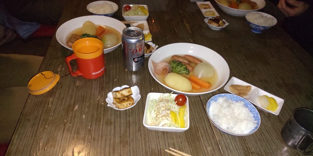 NT6:18発 東日本橋、新宿経由で8:45秦野着 山友と合流して9:04のバスでヤビツ峠に9:52着 晴天の週末でヤビツ峠にも人、車、バイクが一杯 10:00に出発し護摩屋敷の水を補給して二ノ塔、三ノ塔に登る。三ノ塔には登山客が沢山いた。昼食をとった後に急下降して烏尾から行者ケ岳に向かう。行者の岩場、大日小屋跡を過ぎて木ノ又小屋に着いた。定員15名の小さな小屋で本日の宿泊は11名。一泊夕食付きで7000円。受付を済ますと昆布茶がでた。塩気が美味しい。小屋内はストーブで暖かい。持ってきたビールとお酒でゆっくりと雑談。小屋の近くの展望台から夕暮れの富士を楽しむ。夕食はポトフでこれが美味しい。夜に展望台に行って夜景を楽しむ。20時に就寝 布団と毛布2枚で暑いくらいであった。