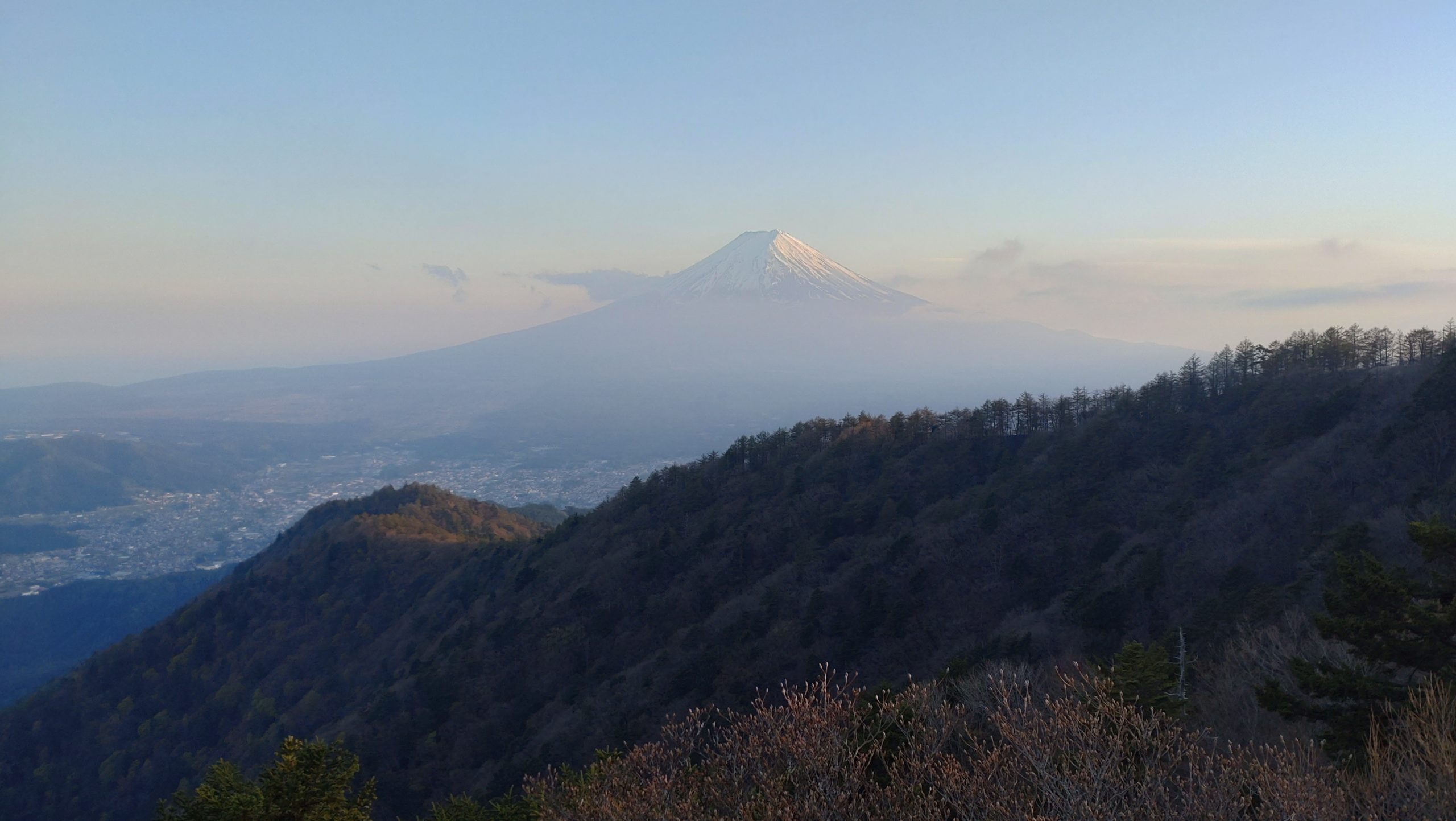 6:05NT発 武蔵野線、中央線、富士急を乗り継いで三つ峠駅に9:50着。達磨石まで1時間20分。 馬返しからはやや急坂となる。高曇りで時々日がさすが、富士山上部は雲に隠れている。屏風岩では10名位が素足でクライミングの練習をしていた。開運山に登ったが富士山はやはり見えない。外国人観光客が数名来ている。ここまでは観光旅行の範囲内か。三つ峠山荘に行き宿泊手続きをする。コタツのある個室に1人で窓から富士山が見える。1泊2食で9500円。缶ビールを買って外のテラスでゆっくりする。夕暮れになると富士の雲がとれてやっと全体が見えるようになった。夕食時には熱燗を追加して頼んだ。同宿者は2名だけであった。やることもないので20時には就寝した。