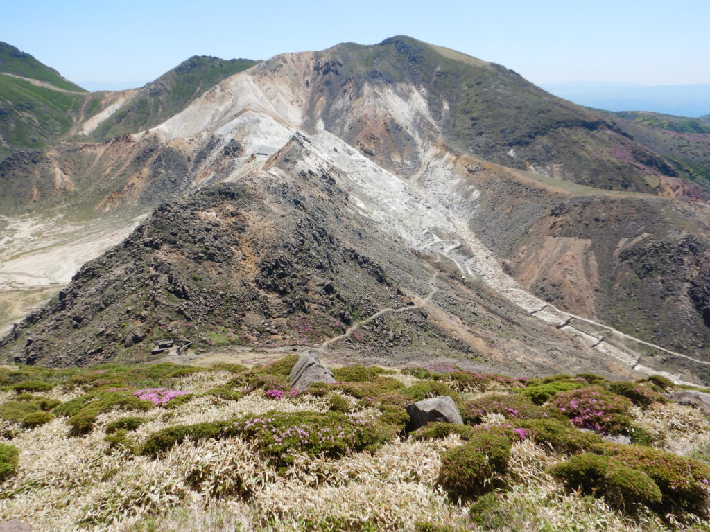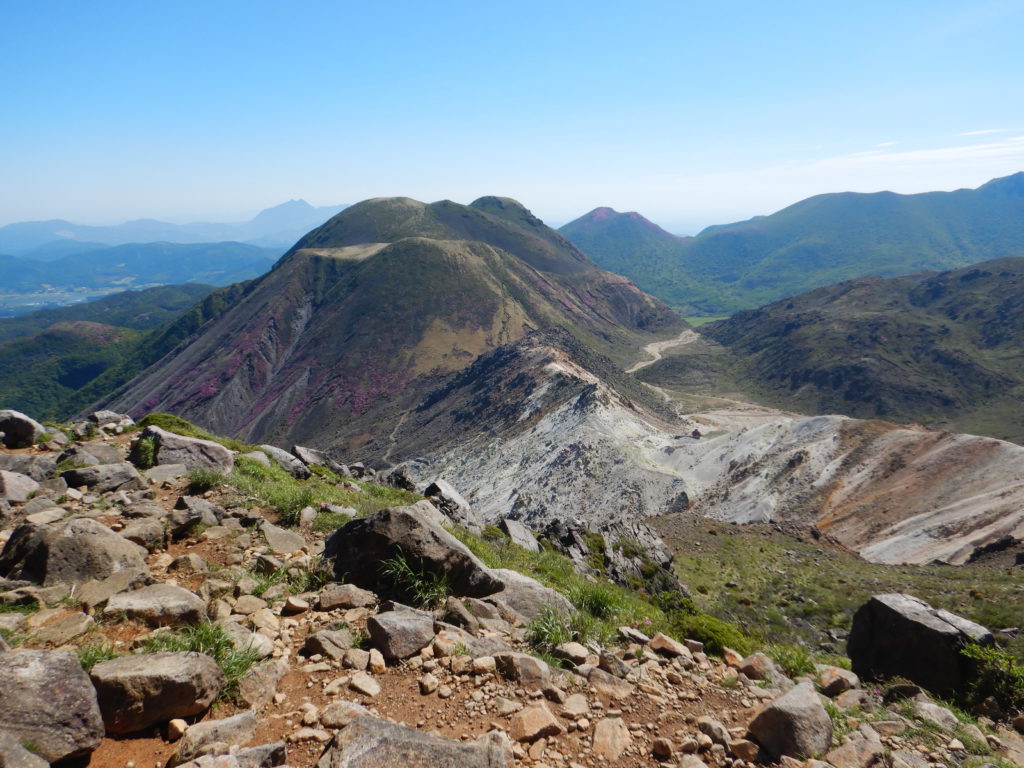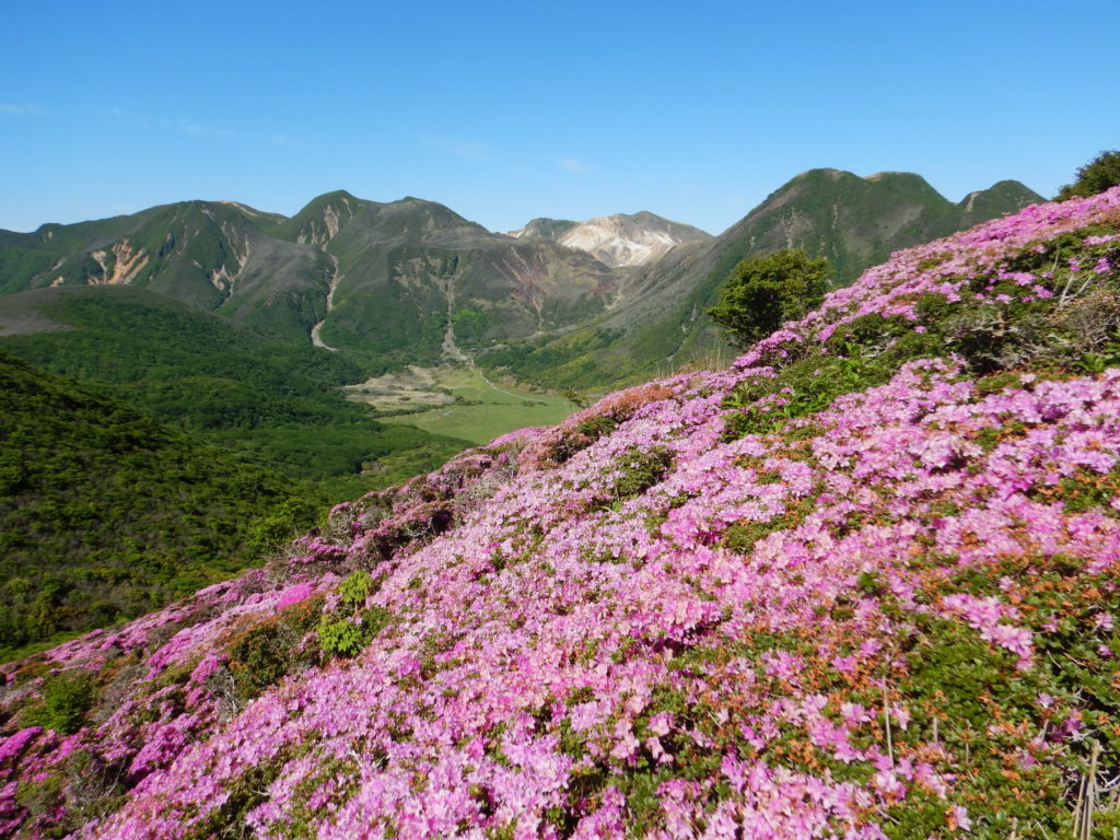 6:40朝食 7:35出発 キャンプ場の先はぬかるんでいるが、その先で石のゴロ道を登って大戸越到着 ここから見上げる平治岳はミヤマキリシマでピンクに染まっている。花の間を登り平治岳山頂部へ。一帯がミヤマキリシマで埋め尽くされている。これだけ咲いたのは3年ぶりとのこと。大戸越から法華院温泉に戻りスガモリ越に登る。スガモリ越から三俣山西峰、本峰、南峰を登ってスガモリ越に戻り、曲がり駐車場に下った。ここから自動車道を30分くらい登って牧ノ戸峠に戻った。