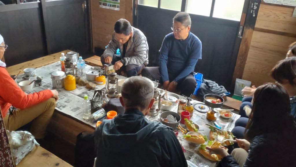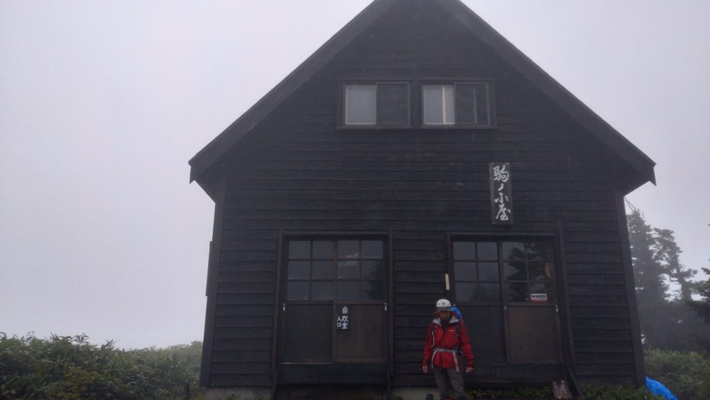 雨が降っていなければ駒の池脇のベンチで自炊ができるが、雨の時は小さな自炊部屋を使うしかない。10数名で自炊する。600円の缶ビール、担ぎ上げた日本酒で喉をうるおし、最後はカレーライスとした。常連の皆さんは顔なじみでワイワイやっているが一見さんは入りこみつらい。乾燥室にストーブはあるがほとんど乾かない。トイレは小屋裏にあり長靴で木道を行かないといけない。20時に消灯すると真っ暗になる。0時頃トイレに行ったが外はガスであった。