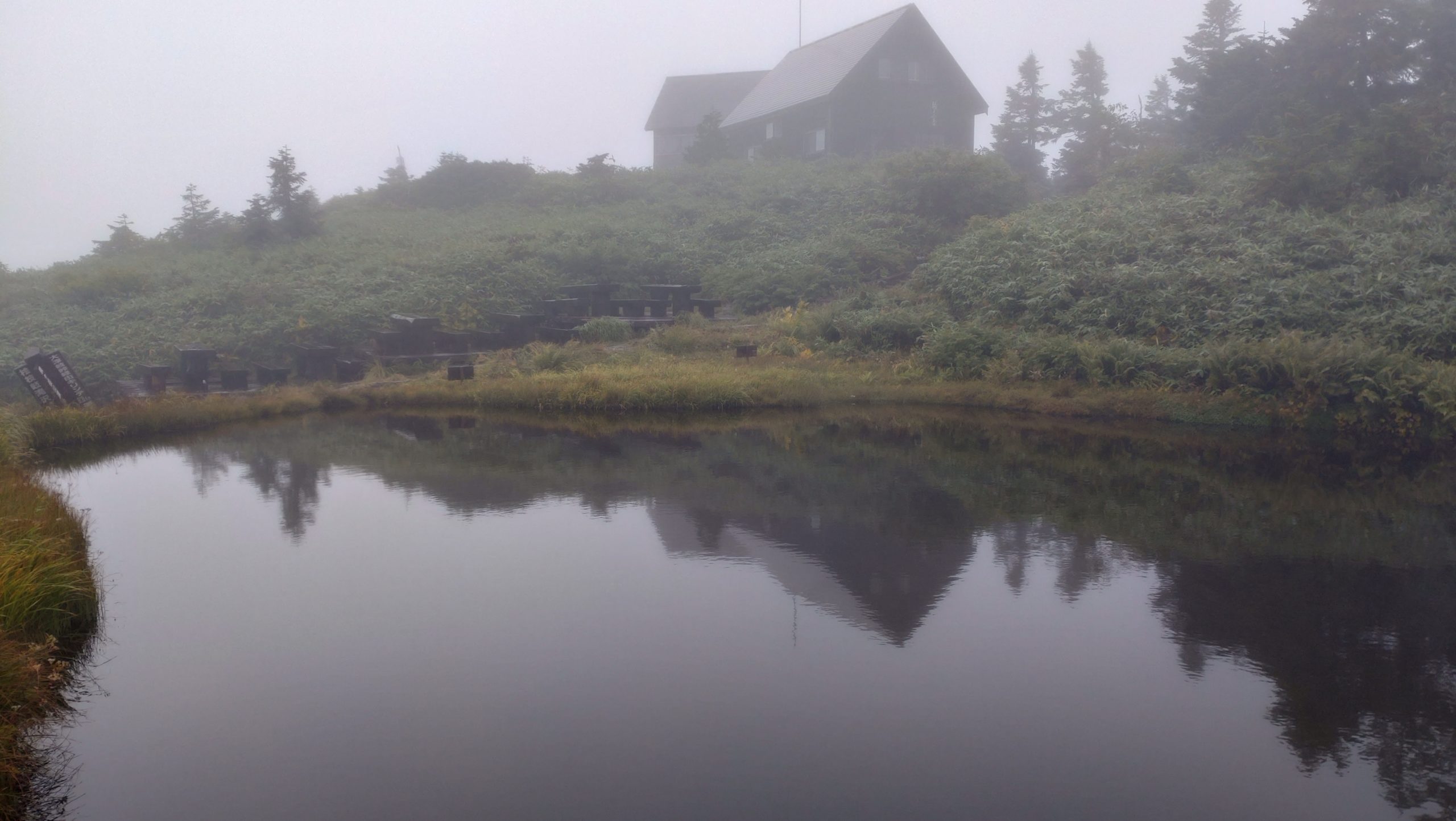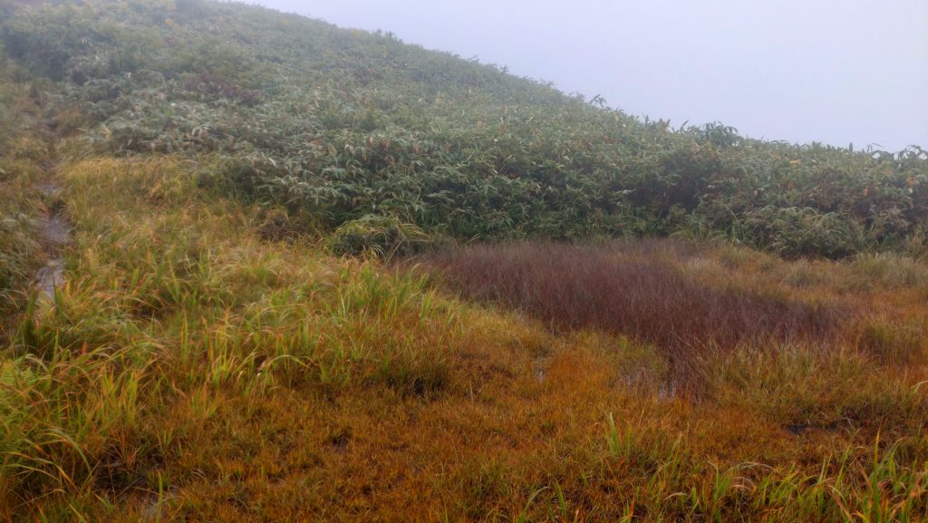 6時頃起きだし餅入りラーメンで朝食 7時過ぎに会津駒に向かう。山頂でも何も見えず。小屋に戻る木道でスリップして笹の中に転げた。小屋から大津岐峠に向かう。樹林の尾根を進むと岩場が出てきた。トラバースしていったところでスリップして左斜面に滑落 一旦止まりかけるがさらに落ちて7-8m落ちて止まった。木の枝と岩を掴みながらよじ登って登山道に戻った。膝、手首に擦り傷を負いストックを紛失した。当初計画の御池まで行くのはあきらめてキリンテにおりることにする。尾根上には草原と池塘が点在し、好天なら気持ちよさそうなところである。大津岐峠からは緩やかな山道を延々と下りキリンテで雨具を脱いだ。車道を1時間歩いて桧枝岐の街中を抜けて駐車場に戻った。帰路は窓明の湯で汗を流し友部SAで夕食を済ませて20時に帰宅した。 (マコミズ記)