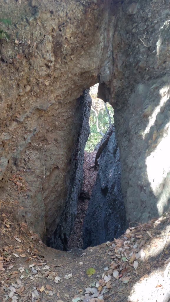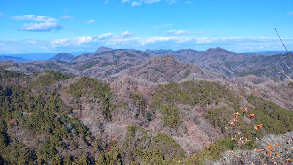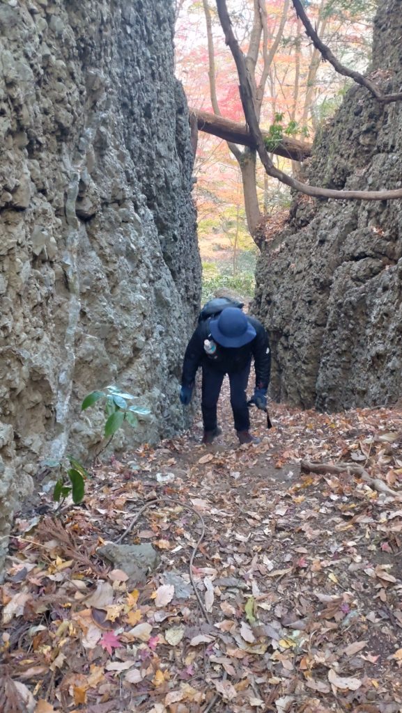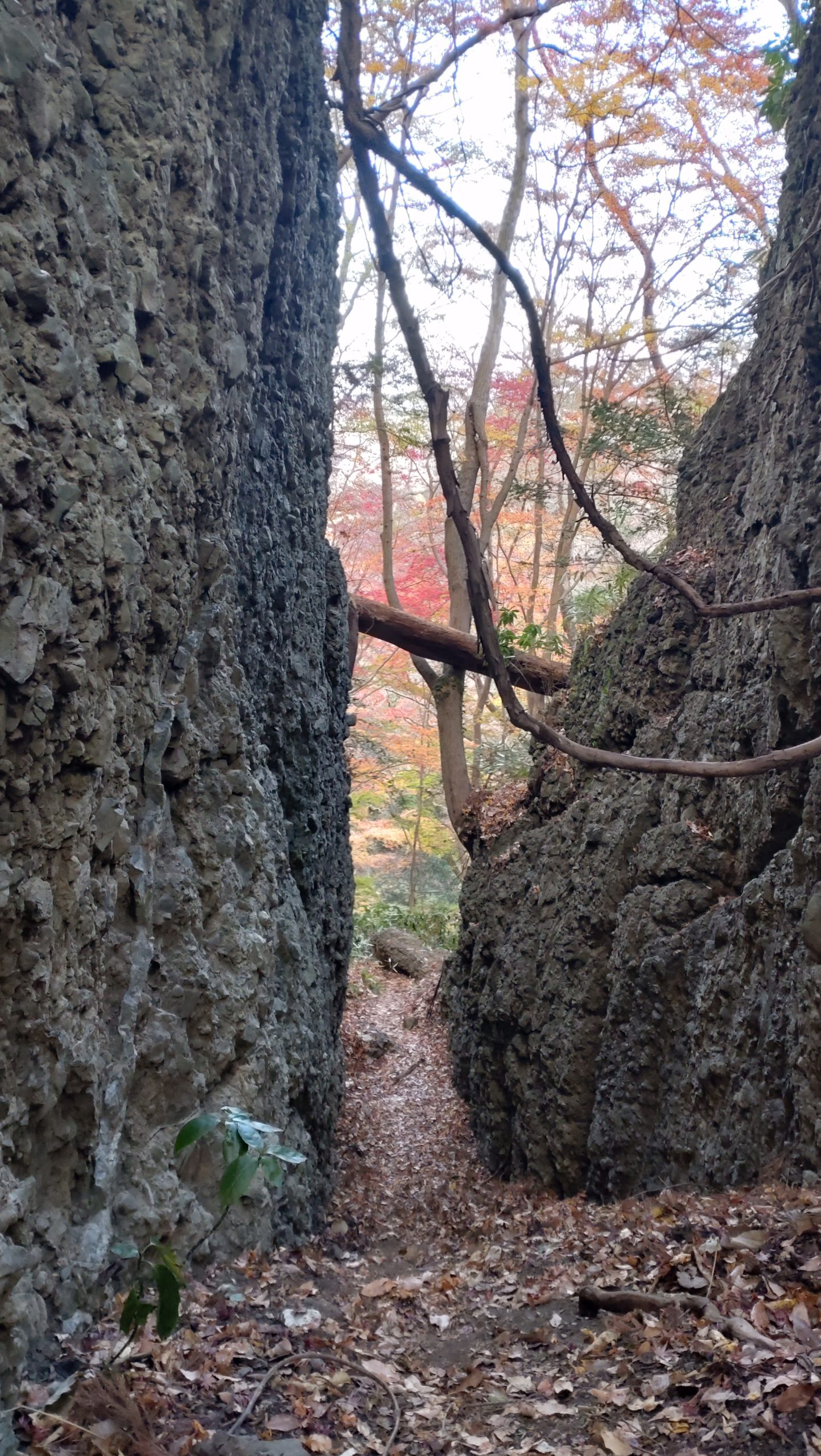 6時にNT出発 牛久阿見IC、那珂ICを経由して8時半に西金砂神社に到着した。神社の前に巨大な御神木(いちょうとサワラ)が2本立っている。鳥居をくぐり拝殿を過ぎると金砂山の山頂に本殿がある。そこから尾根縦走が始まるが小さなアップダウンが多く、土の斜面はむき出しで滑る。片側は崖になっていて落ちるとやばい。地割は岸壁が割れて穴があいている。面白い構造である。おかめ岩からは奥久慈の山並みと筑波山がよく見える。おかめ山は西峰と東峰の双耳峰(双耳岩)となっていて竜神吊橋が見えた。尾根を戻る途中のコルで「かきあげうどん」を作って食べた。この時期は暖かいうどんが美味しい。地割を過ぎた先で単独のおばさんに遭遇し、地割に行ってきたというので話を聞いたら第二地割がありこっちの方が絶景だという。YAMAPにはルートが載って無いがおばさんに教えてもらった。410mピークから東に進み安龍ケ滝への標識から北の尾根に入ってその先に第二地割があった。完全に割れた岩の先に紅葉が見えて確かに絶景であった。12月初めであれば紅葉がもっと素晴らしかったであろう。標識に戻り安龍ケ滝経由で神社に戻ることにした。坂を下り小さな沢を渡って少し下流に下ると水の涸れた安龍ケ滝があった。この近くから神社に行く道があるはずだと探したが見つからず、あきらめて標識まで登り返してから日没の夕陽を見ながら何とか明るいうちに神社に戻った。(マコミズ記)