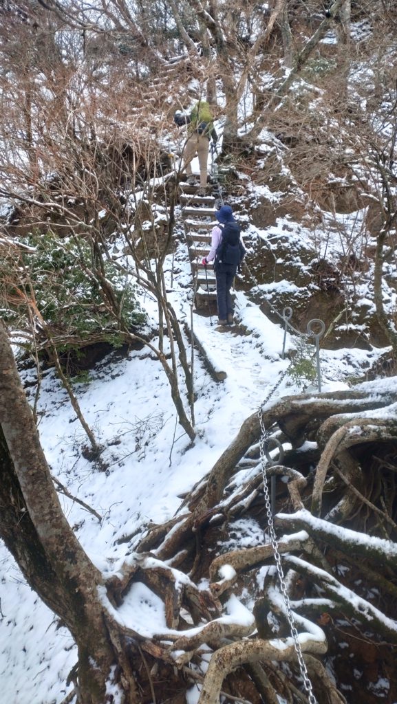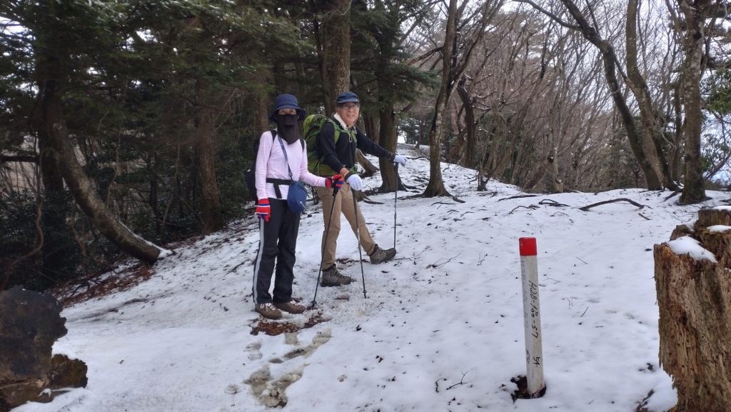 意思疎通不十分で本厚木でバスに乗り遅れ登山開始が計画より1時間遅れたこと、稜線上の雪により大山まで行くことは断念したが仕方ないか。大山三峰の稜線は丹沢には珍しいくらいの細い岩尾根であった。